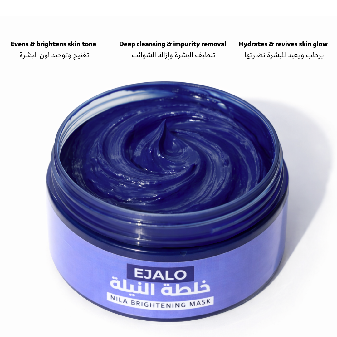 ماسك تفتيح مركّز ولطيف مُصمَّم خصيصًا للوجه والمناطق الحساسة فقط. غنيّ بالنيلا المغربية الزرقاء الطبيعية والطين الأبيض، يساعد على تفتيح البشرة، توحيد لونها، حمايتها من التصبغات، وإعادة الإشراقة الصحية والطبيعية.