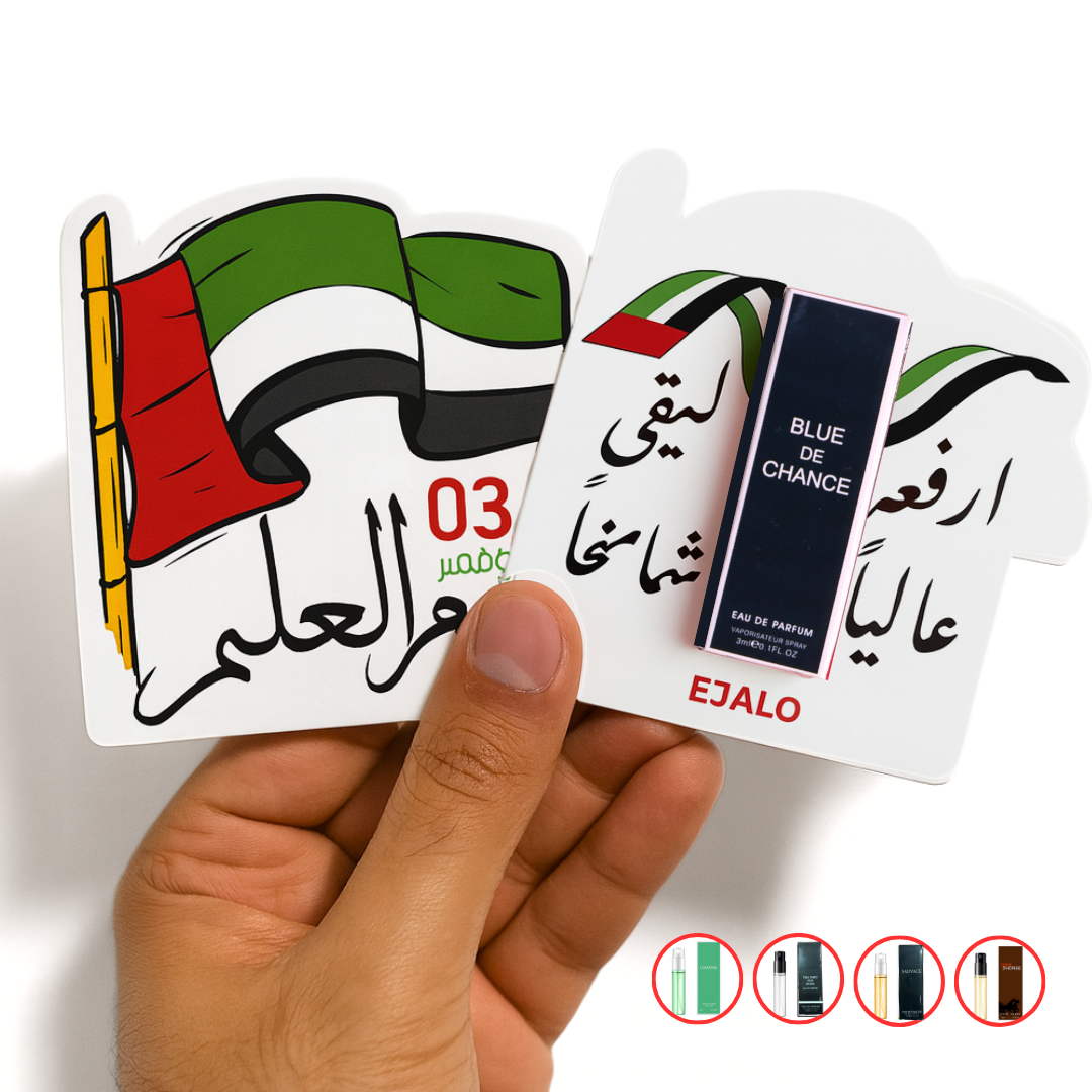 تأتي العطور في بطاقات وطنية مميزة تحمل علم دولة الإمارات، لتكون 🇦🇪 التوزيعات المثالية للمدارس أو المكاتب لهذه المناسبة