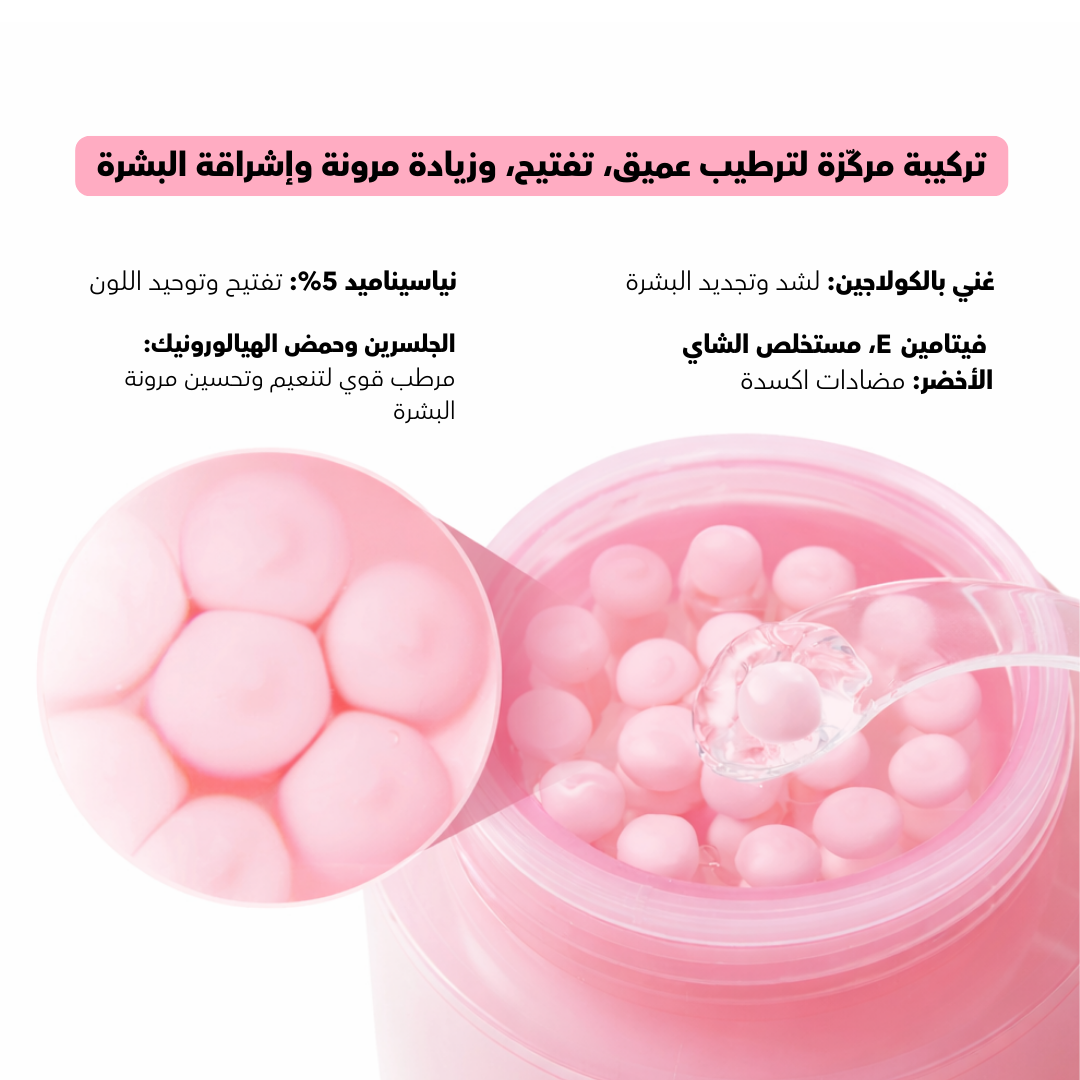Pink Collagen Capsule Cream helps improve skin tone and enhance the radiance of dull and sagging skin. The capsules preserve the firming and hydrating benefits until fully absorbed, delivering a glass-like glow. It evens out uneven skin tone, while Collagen and Hyaluronic Acid provide deep hydration and healthy radiance. Niacinamide promotes a healthy, luminous complexion.