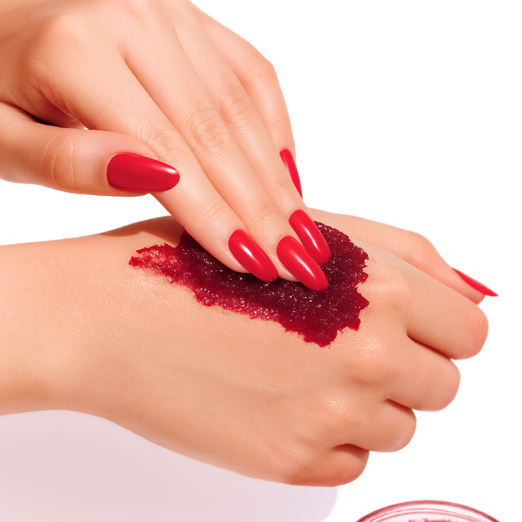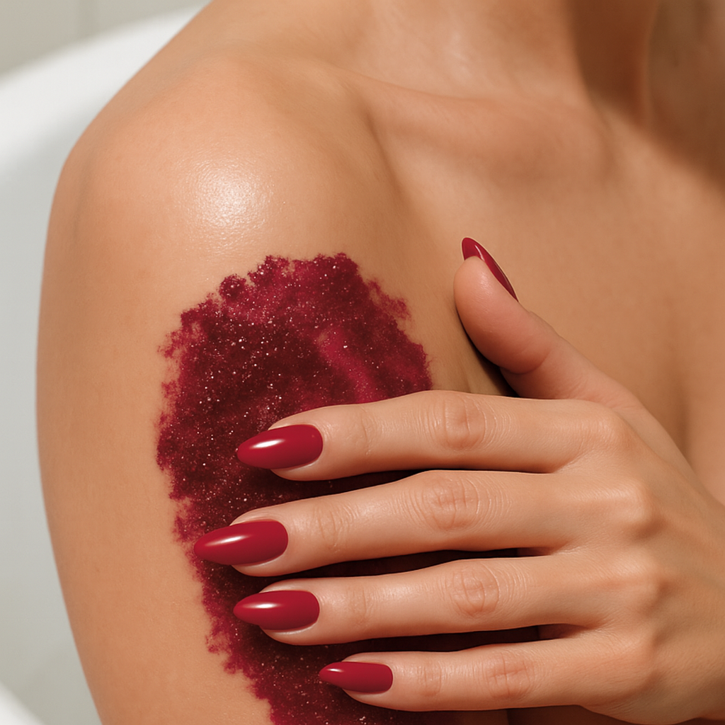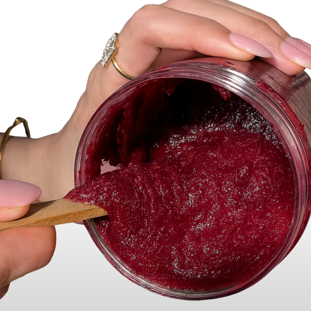 Ingredients: Natural fine sugar, Hibiscus extract, Argan oil, Olive oil, Rose extract, Aloe vera extract.
